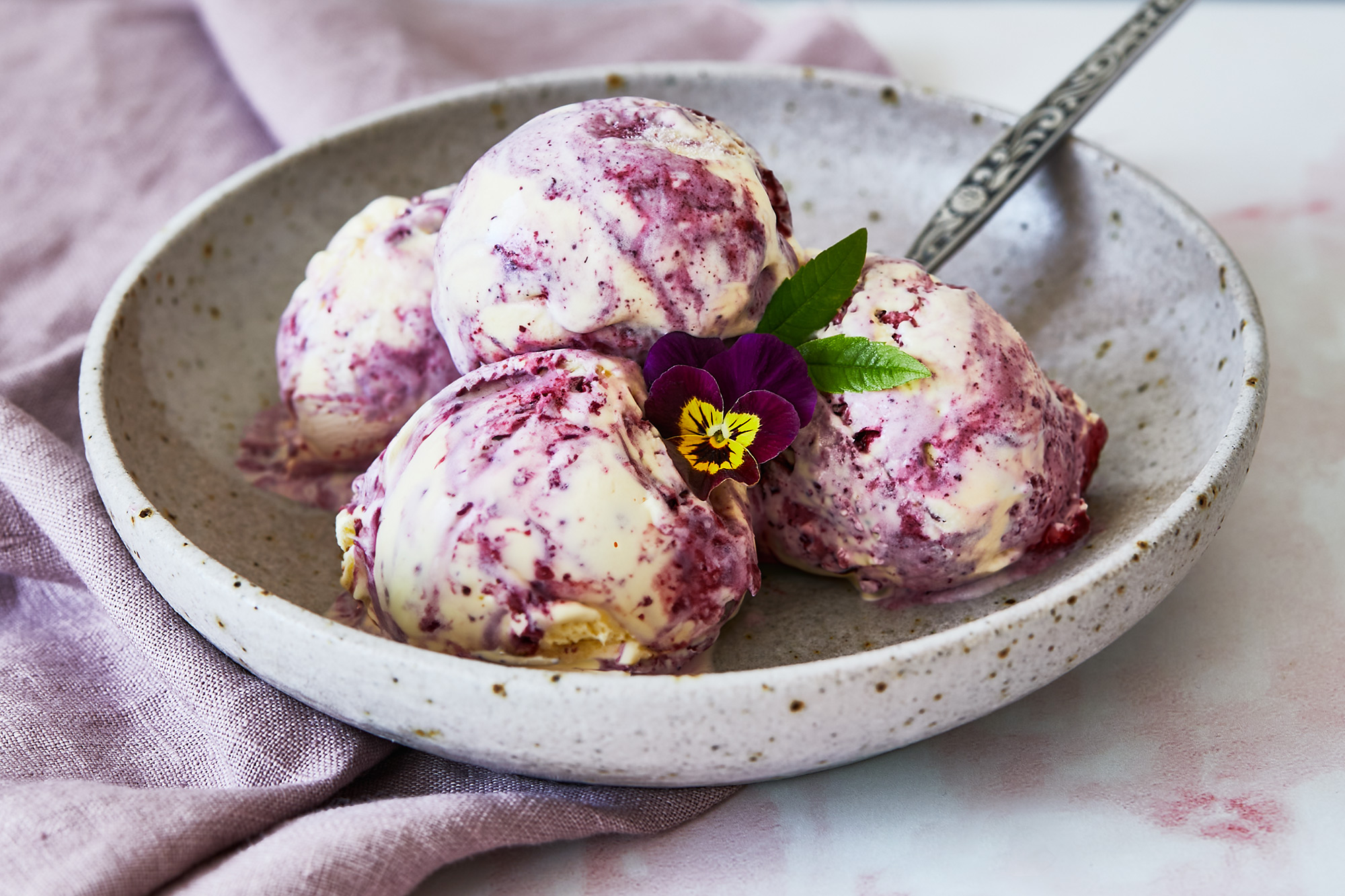 Blackberry ripple, brown butter and bay leaf ice cream by Cheryl Minton.